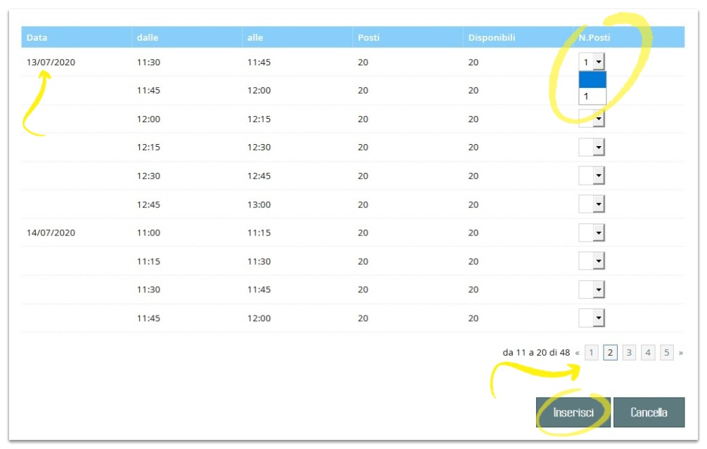 - Seleziona una fascia oraria qualsiasi valorizzando come 1 la tendina di N. posti ► Inserisci:
